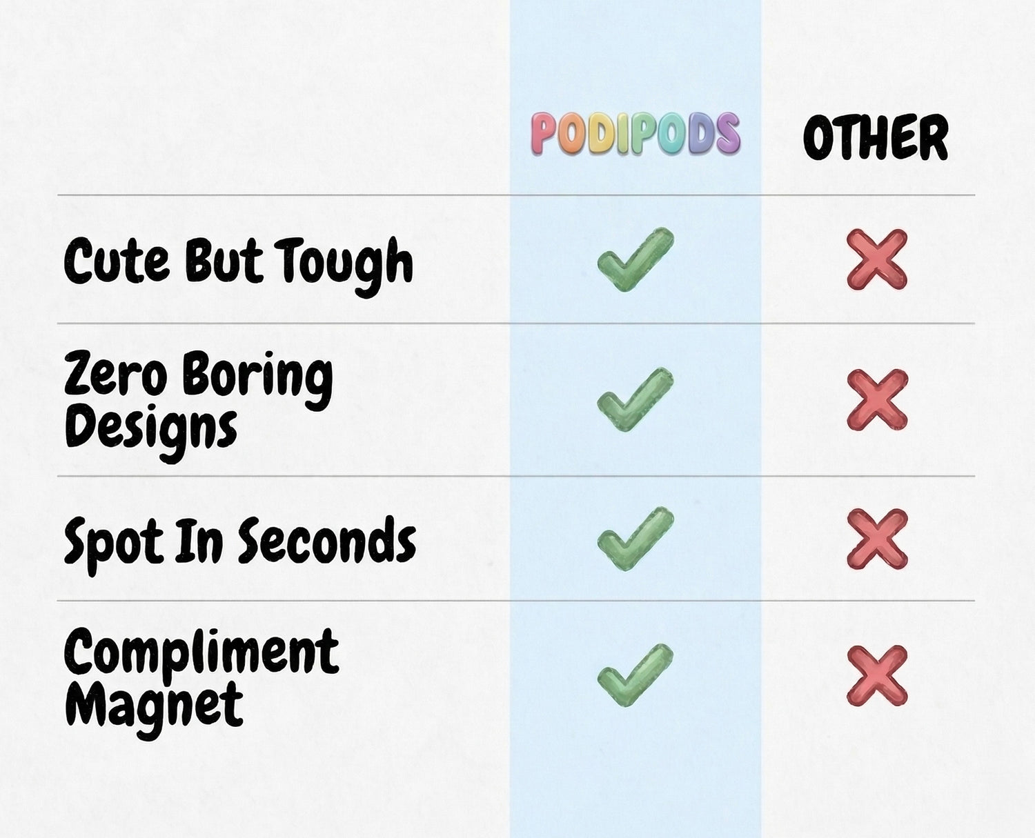 Ditch the generic. Stand out with Podipods. Our cases aren't just cute but tough, making them the perfect blend of style and durability. With designs this unique, you'll spot them in seconds and collect compliments wherever you go.